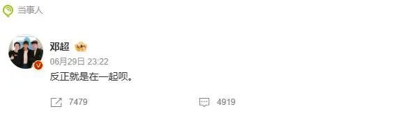 陈赫在直播中透露邓超正与鹿晗聚餐,当晚,邓超在微博发文回应:“反正就是在一起呗。”